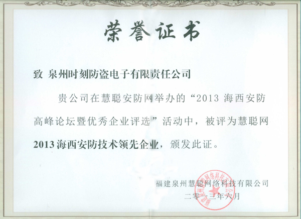 Warmly celebrate our company won the "2013 Haixi security technology leading enterprise"