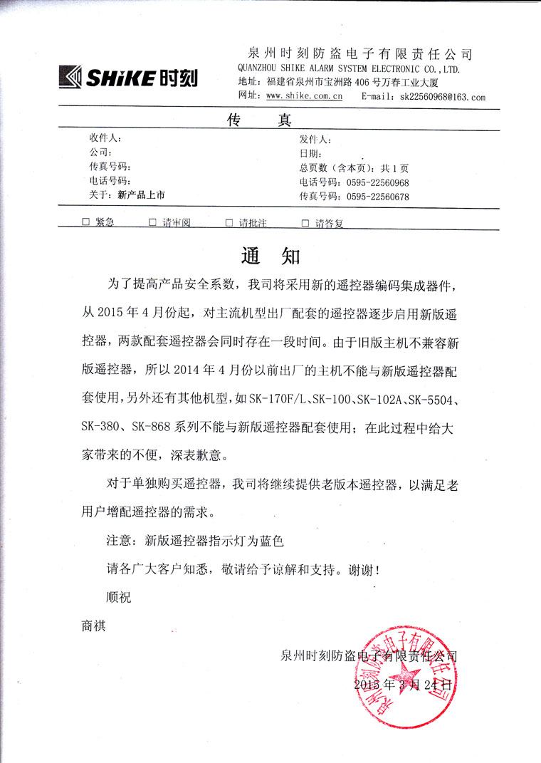 为了提高产品安全系数,我司将采用新的遥控器编码集成器件,从2015年4月份起,对主流机型出厂配套的遥控器逐步启用新版遥控器,两款配套遥控器会同时存在一段时间。由于旧版主机不兼容新版遥控器,所以2014年4月份以前出厂的主机不能与新版遥控器配套使用,另外还有其他机型,如SK-170F/L、SK-100、SK-102A、SK-5504、SK-380、SK-868系列不能与新版遥控器配套使用;在此过程中给大家带来的不便,深表歉意。