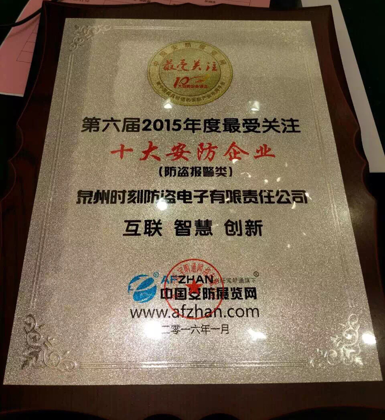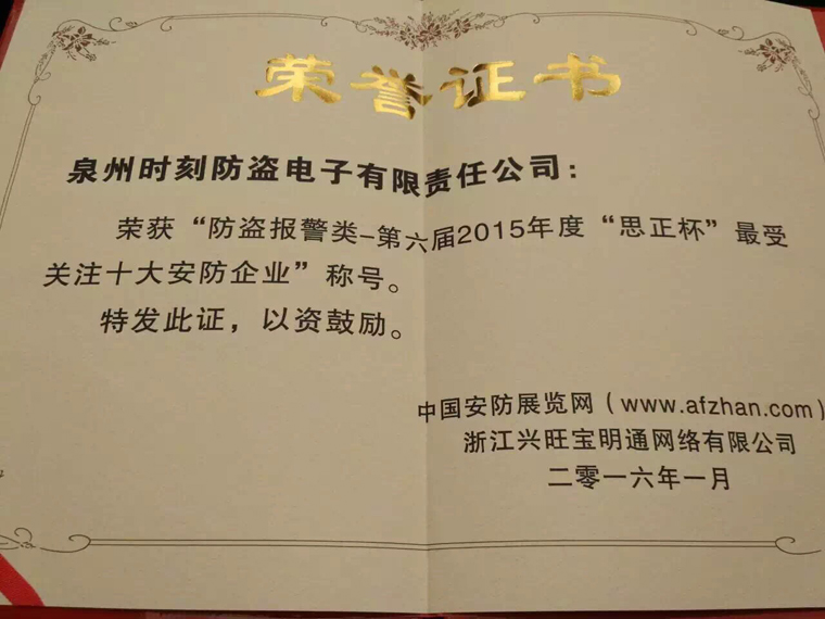 随着互联网、物联网等创新科技的快速发展,安防行业正面临着前@@所未有的机遇和挑战。在整个社会高度网络化的趋势下,打造和构建互联网品牌形象成为企业在互联网大潮中屹立不倒的首要条件。安防行业紧随潮流,与时俱进,借助“互联网+”战略,实现与传统行业的融合发展。2015年12月21日,经过近半年的线上、线下紧张激烈的投票,及安防行业专家专业评审,我司成功蝉联“第六届‘思正杯’2015年度最受关注十大安防企业”称号